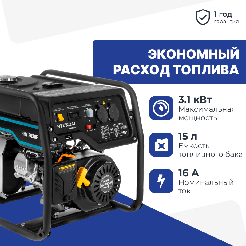 • Hyundai HHY 3020F оснащен автоматическим стабилизатором AVR, который не допускает скачков напряжения, что важно для чувствительной техники, например, отопительных котлов, компьютеров.