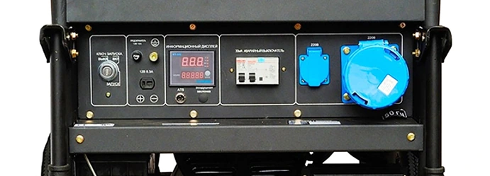 На панели управления находятся две розетки переменного тока напряжением 220 В для подключения однофазных потребителей. Есть дополнительный выход постоянного тока 12 В, который используется для зарядки автомобильного аккумулятора.