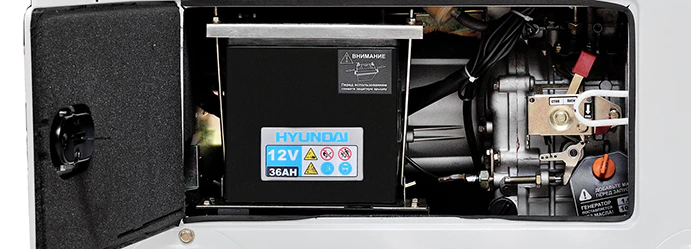 Дизельный генератор Hyundai DHY 6000SE-3 оснащен специальным закрытым кожухом, который защищает аккумулятор от загрязнений и осадков. Это единственная электростанция в модельном ряду, которая при максимальной мощности 5,5 кВт подключается к однофазным и трёхфазным потребителям с розетками до 32 А.