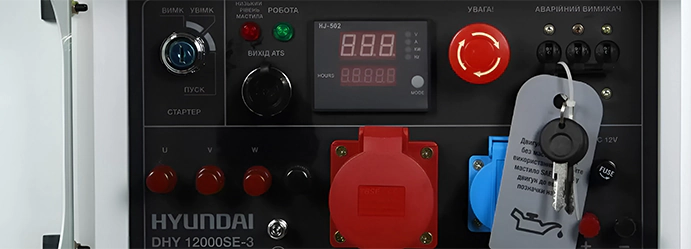 Hyundai DHY 8500SE-3 можно использовать в двух режимах: для питания однофазного или трехфазного оборудования, для чего на панели управления предусмотрены розетки 220 В и 380 В. В первом случае максимальная нагрузка может достигать 2,4 кВт, а во втором – 7,2 кВт. Для подзарядки аккумуляторов есть выход на 12 В.