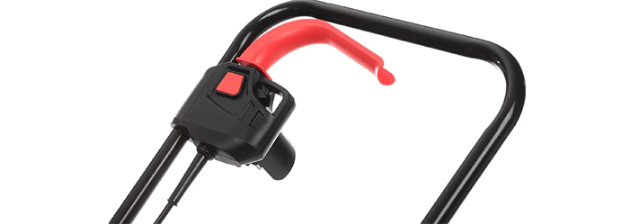 Управлять газонокосилкой очень просто: она включается с помощью кнопки и рычага. Для защиты от случайного запуска есть специальный предохранитель. Для непредвиденных случаев предусмотрена функция экстренной остановки.