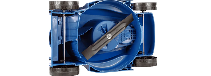 Высота скашивания настраивается переставлением двух осей колес в нужный паз: 20, 40 или 60 мм.