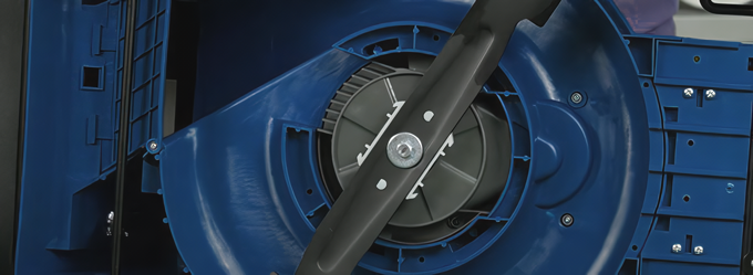 Электромотор обеспечивает высокую скорость вращения ножа 3400 об/мин, что гарантирует аккуратный срез. Двухлопастное лезвие аэродинамической формы создает воздушный поток, который приподнимает даже влажную траву. Такая технология гарантирует ровную и равномерную стрижку газона с первого прохода.
