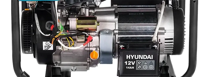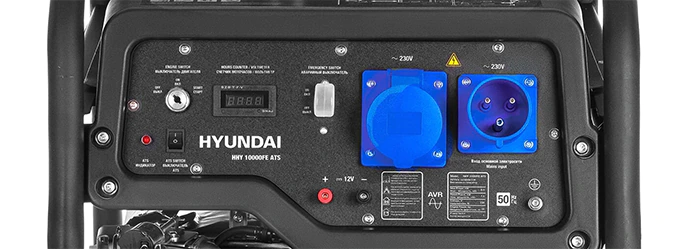 Генератор Hyundai HHY 10000FE ATS оснащен четырехтактным двигателем мощностью 18 л.с., который заводится с помощью ручного или электрического стартера. Время работы на полном топливном баке при половинной нагрузке составляет 14 ч. Потребителей электроэнергии можно подключать к силовой розетке или вилке напряжением 230 В на 32 А. Выход постоянного тока напряжением 12 В дает возможность заряжать аккумулятор автомобиля.