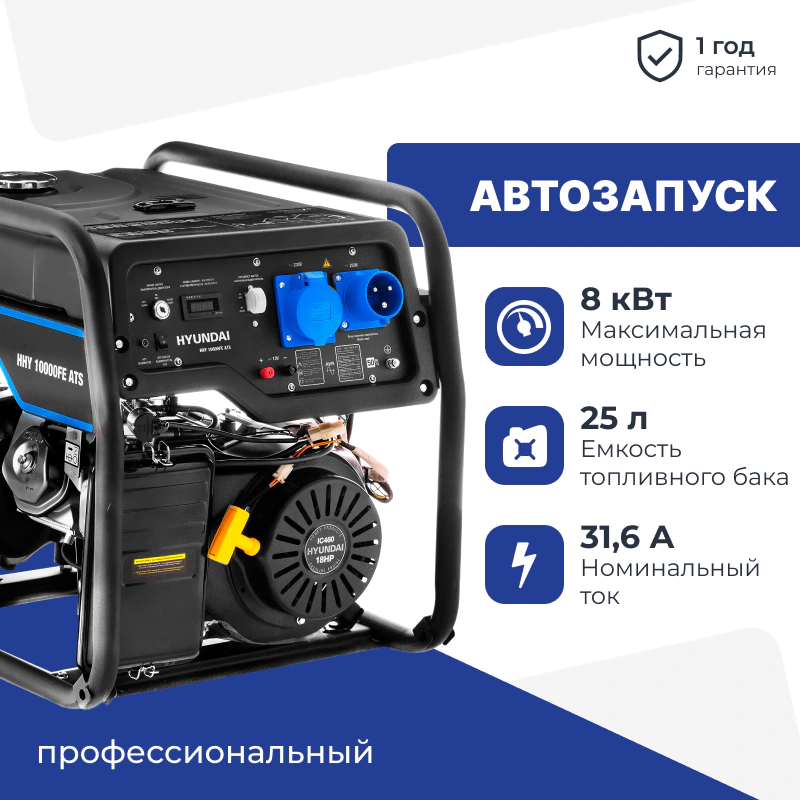 Бензиновый генератор Hyundai HHY 10000FE ATS предназначен для бытового и профессионального использования. Удобство системы автоматического перехода к автономному питанию в случае отключения центрального электроснабжения по достоинству оценят владельцы коттеджей и загородных домов.