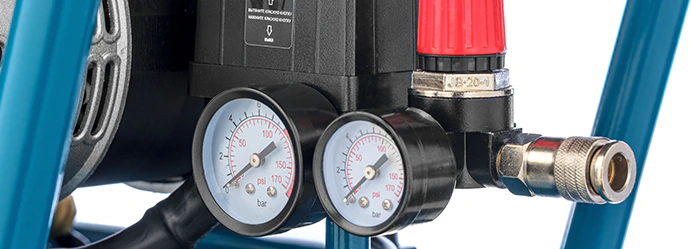 Компрессор оборудован двумя манометрами, отображающий давление в ресивере и на выходе.