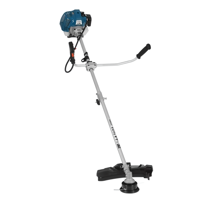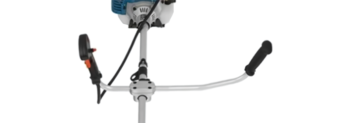 Бензотриммер рассчитан на большие нагрузки и продолжительную работу, поэтому оснащен удобной рукояткой велосипедного типа. Такая конструкция позволяет совершать широкие размашистые движения косой без риска потери управления. Кнопка включения привода расположена прямо под пальцами, что обеспечивает наилучший контроль. Для равномерного распределения веса инструмента на обе руки и плечи предусмотрен двухплечевой ремень.